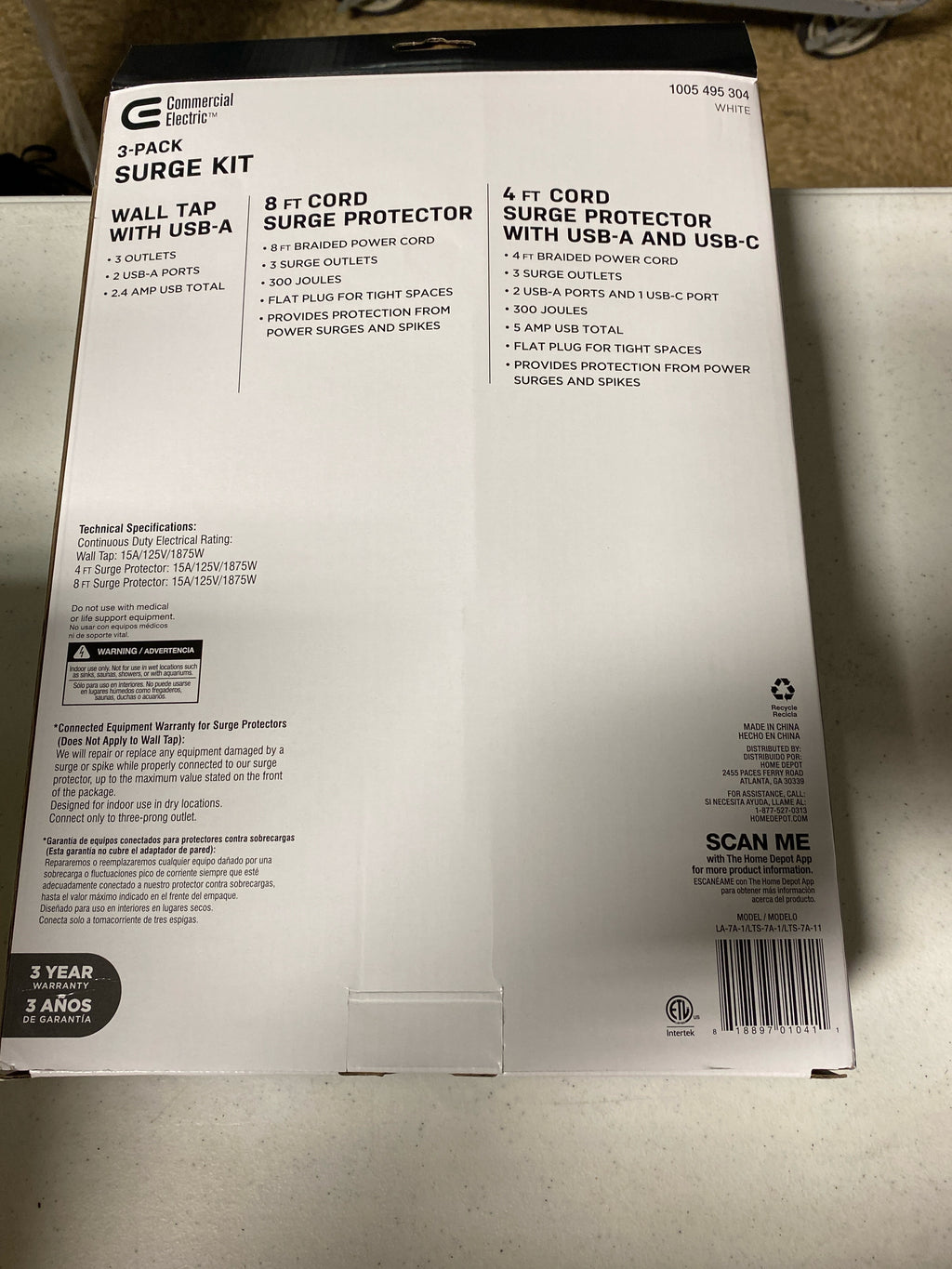 Commercial electric 7A-11,7A-1,7A-1 4 ft. Multiple Outlet and Wall Mounted Surge Protector Set (3-Pack)